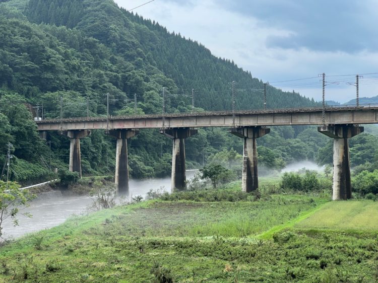 でもまあ、この県境からさっきの鉄道橋を眺めるのもなかなか味があるよね、と思って眺めていると、おや?なにか、鉄道橋の足下が、ステージ上の演歌歌手みたいになっているよ。スモーク……?