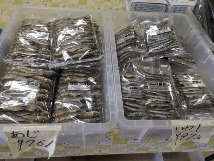 売り場で目についたのは焼き干しだった。青森県の至る所で「煮干しラーメン」の看板やのぼりを見かけるが、源流はこの辺りで昔から作られている焼き干しではないか。高価なので手ごろな煮干しに置き換わった――と、私は推測している。焼き干しといえば普通はイワシ。しかしここではアジの焼き干しも売っていた。アジの焼き干しを見たのは初めてだ。どんな出しが出るのだろう。「アジ 焼き干し」で検索するとヒットは3件だけだった。1軒は釣り好きの自作日記。2件はむつ市の海産物を扱う会社と、この「まるごと青森」のページだった。つまり青森特産、しかも極めてレアな食べ物なのだ。