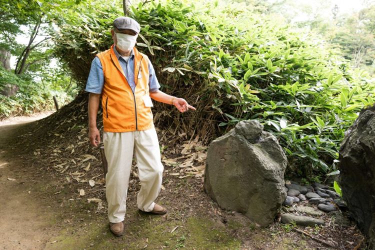 25 体の菩薩が宿っているという遠山石(えんざんせき)を差しながら、この庭の構成を熱く語ってくれました。