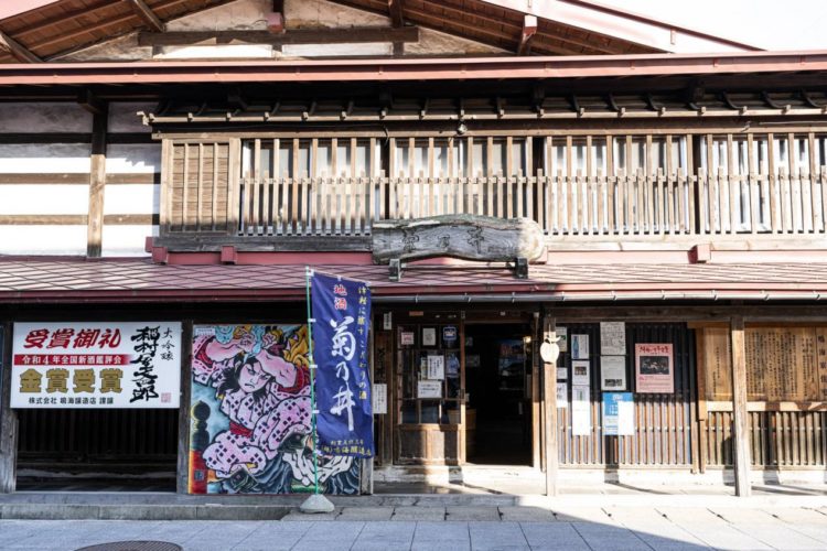 こちらがチケットに含まれているお猪口を頂ける鳴海醸造店です。1806 年創業で黒石の中でも一番古い酒蔵で、「菊乃井」「稲村屋」「稲村屋文四郎」などの銘柄で有名な酒蔵(私は稲村屋を好んで飲んでます)。