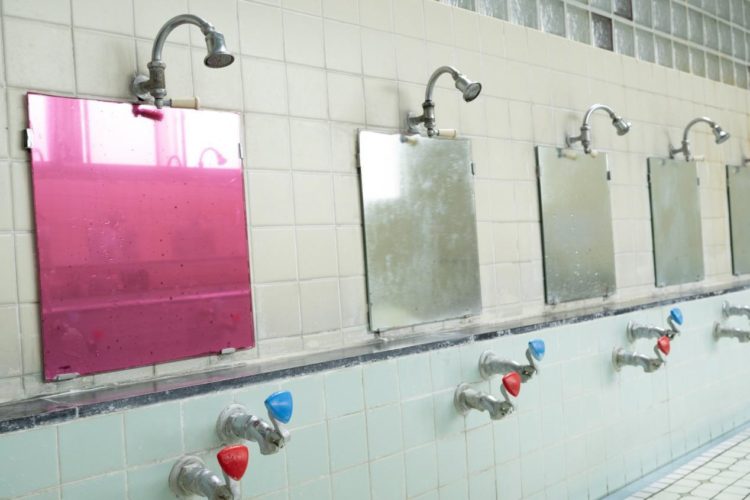 男湯の方は濃いピンクの鏡に(ご主人にお願いして、人がいないタイミングを待って撮影させて頂きました。お風呂内は基本的に撮影禁止です。ご注意くださいませ)。