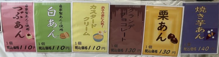 レギュラー商品はつぶあん、白あん、カスタードクリーム、グランデチョコレート、栗あん。お客様から「この味食べたい!」という要望を聞いてみたり、子供たちからメニュー案が出たりして、現在のラインナップになりました。その他に季節限定メニューもありますよ。今の時期は焼き芋あん!