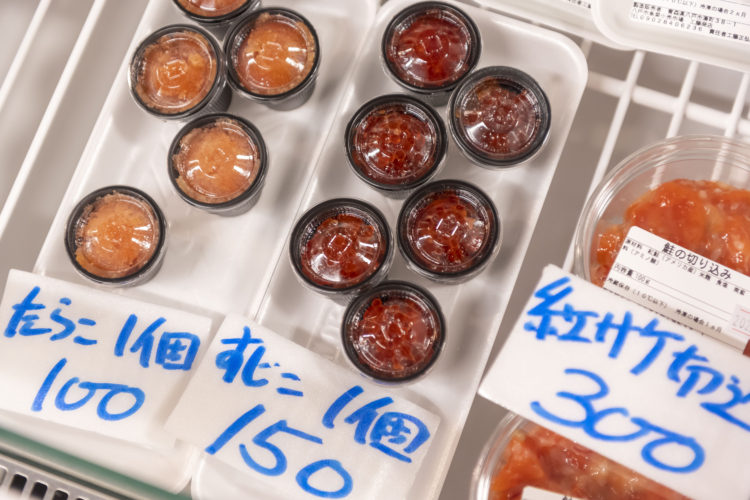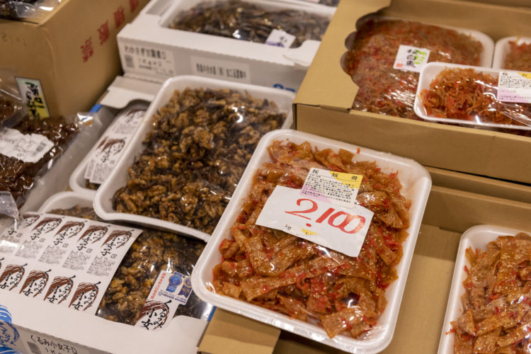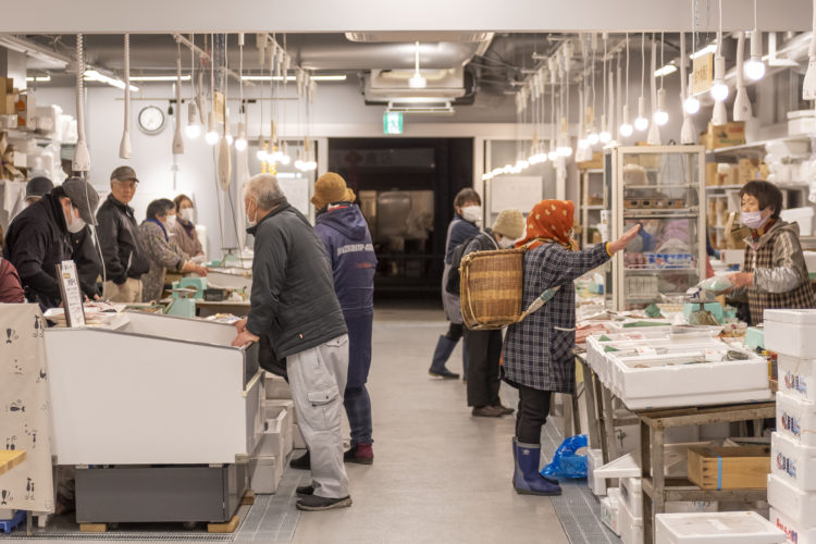 店舗は、八戸に水揚げされたばかりの新鮮な魚介類、豊富な珍味乾物、丹精を込めて作られた漬物など盛りだくさん。店子の人達と対面で会話をしながら買い物をするのが楽しいんですよ。