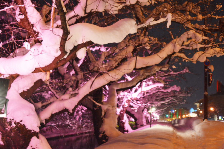 さて、新年!ということで、縁起が良さそうな「冬に咲くさくらライトアップ」に行ってきましたよ。何それ?と思った方。こちらは、日本一の桜の名所、弘前公園外濠の桜の木をピンク色にライトアップすることで冬の「桜」を咲かせよう!というイベントなんです。桜の木に雪がこんもり積もった時には満開の「桜」を見ることができるのですよ????