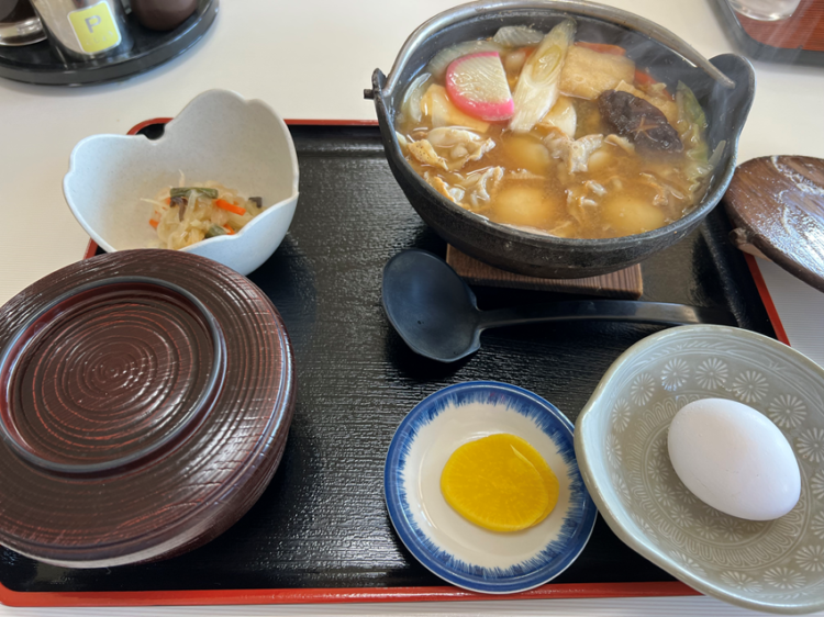 さて、ホタテ鍋が来ましたよ。鉄のお椀で、あっつあつのまま来ました。味噌ベースの汁の中に、ネギや白菜などの野菜やかまぼこと、ホタテがたくさん入ってます。これは間違いなくおいしい。しかし、生卵がついているのがこれまた謎です。鍋に落とすんだろうか?卵かけご飯にするんだろうか?謎は解けぬままです。