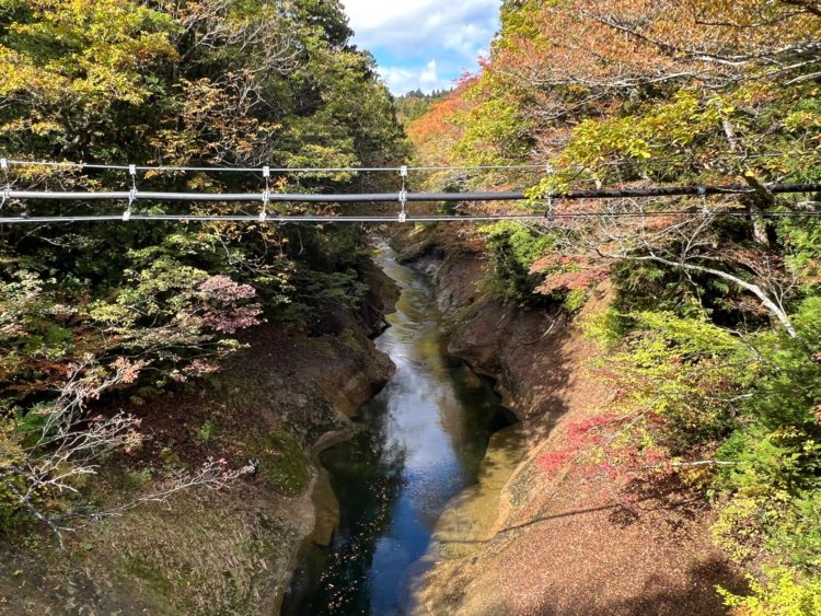 だいたいこの連載では現地で待ち合わせて、車で来た2メートル氏と合流するのですが、今回に関してはかなり早く青森市を出るということで、初めから車でスタートです。まずは延々と国道279号、眠くなりそうな道を2メートル氏が飛ばします。行く予定のドライブインを飛び越え、むつ市街地も越えて、たどりついたのは奥薬研温泉。2メートル氏オススメの、すばらしい紅葉(取材は10月)。