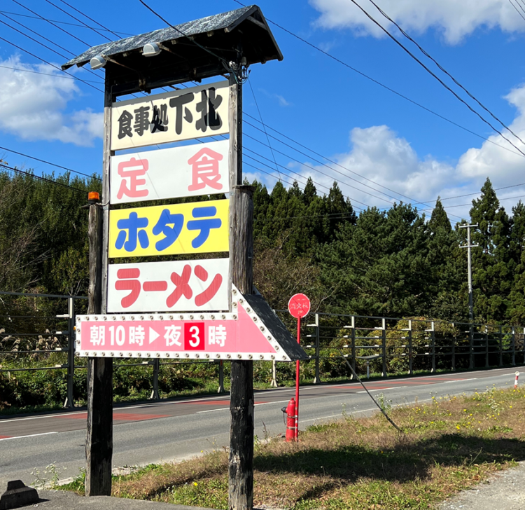 ということで、そこからまた同じ道をひたすら車で戻ります。まず寄りたいのは「ドライブイン下北」。車窓で見かけ、歴史の長そうな建物が気になっていたのです。