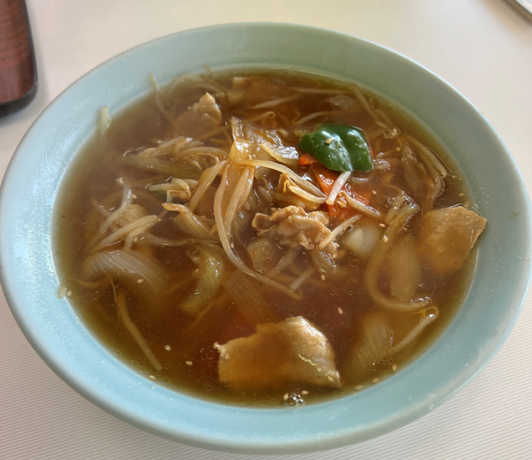 焼肉ラーメンは、醤油ベースのスープにもやしやネギなどの野菜、そして豚肉がたくさん入っている。ラーメンはスープがあと引く味で、飲み干したくなる……と2メートル氏がおっしゃってたので、そうなんだと思います(なんせコロナの世の中なので、ちょっと一口下さいってのがやりにくくてね。私は飲んでいないのです。再チャレンジしたい)。
