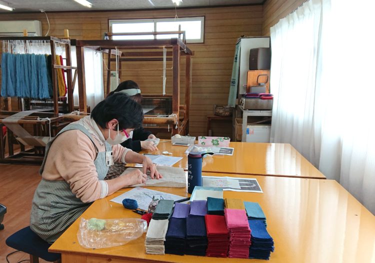 「全部で120人くらい。ただ、全員がつねに稼働してるわけじゃなくて、たとえばりんご農家さんだと、繁忙期は農作業をやって、閑散期にこぎんを刺したり。この内職のシステムに助けられて、製品がつくられてるわけ」