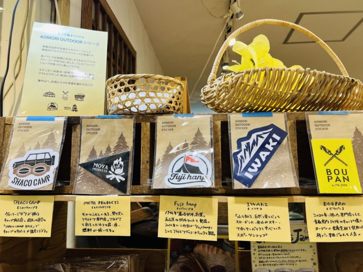 架空の書店だけでなく、翌年には架空のアウトドアショップのロゴグッズも完成しました。遮光器土偶(通称シャコちゃん)に岩木山、青森市民のソウルフード(!?)「棒パン」までロゴ化しています!