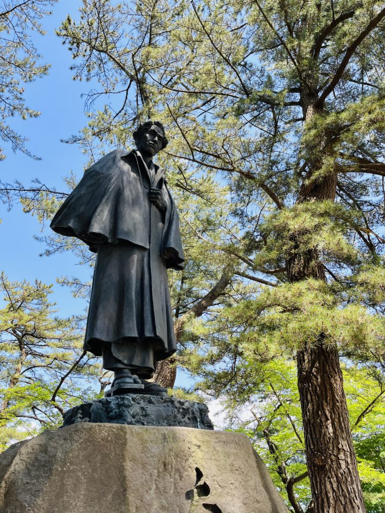 太宰ゆかりの公園ということでこんな立派な銅像もありました。外套姿がカッコイイです。