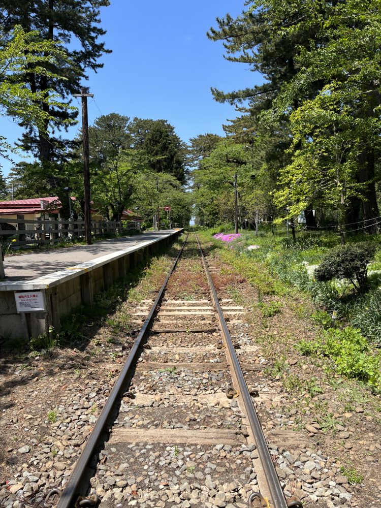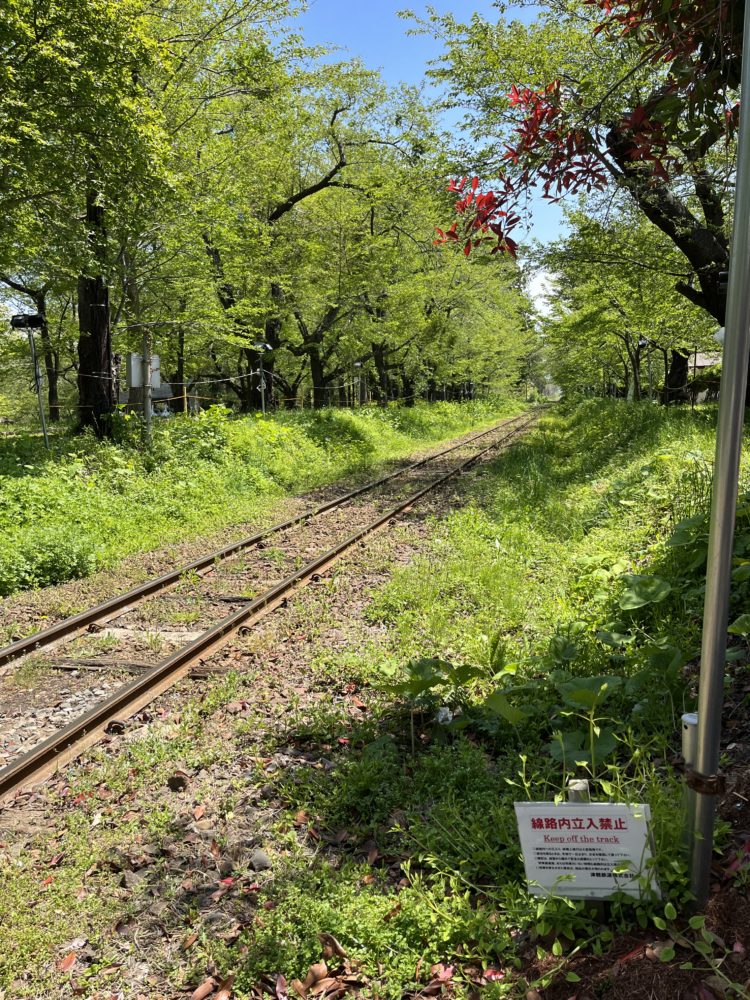 遮断機がないし、「ふみきりちゅうい」の文字があまりにもかわいらしいので、初めは踏切を模したオブジェかと思ってしまいました。線路の周りは敷き詰められたように植物が覆い、ここを電車が走るなんて…まるで絵本かジブリの世界です。