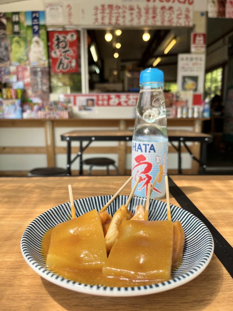 味噌だれがたっぷりかかったおでんがやってきました。ラムネを添えたら一層レトロ気分増し増しです!