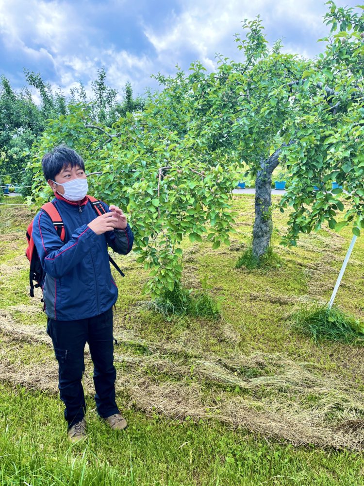 まずは、ご自身がりんご農家であり、工房でシードルも作っているkimoriの高橋さんが園内を回りながらりんごについて色々と教えてくれます。