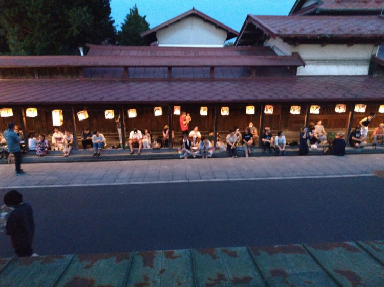 桃は東京に戻ってからの楽しみということにして、黒石に向かった。ねぷた運行のメーンスリートであるこみせ通りの両脇には灯篭が飾られ、4年振りの祭りを楽しみにしていた市民が、陽が落ちる前から早々と灯篭の下に腰をおろして祭の始まりを待っている。