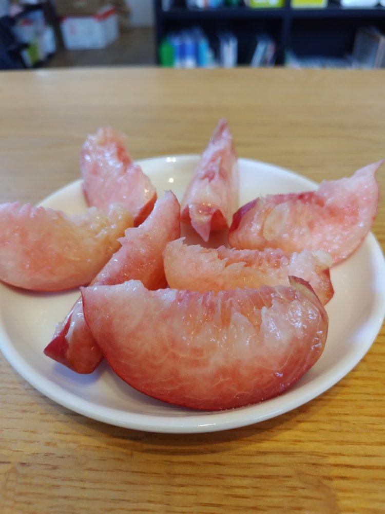 小皿に切り分けた桃がのっている。果実の芯から鮮明なピンク色が広がるこの品種は「夏かんろ」だという。東京のスーパーではお目にかかれない希少品種だ。手に持って口に運ぶ途中から果汁がしたたり落ちる。鼻の前10センチから芳香が漂ってくる。