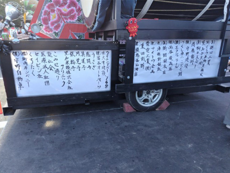 下の方を見ると、ねぷたの製作費用を寄付した企業や商店の名が記されている。クリニック、寺院、飲食店の名前も見え、それだけで黒石のねぷたが地域を挙げての祭りであることがわかる。