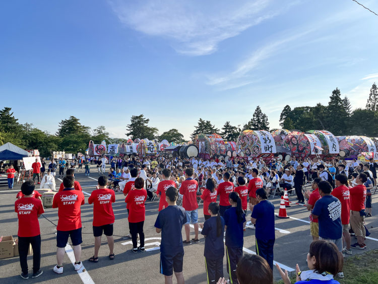 そんな話をしているうちに出陣式の時間になった。会場の御幸公園に行くと、その夜、運行するねぷたが勢ぞろいしていた。ほとんどが扇ねぷただが、人形ねぷたもある。