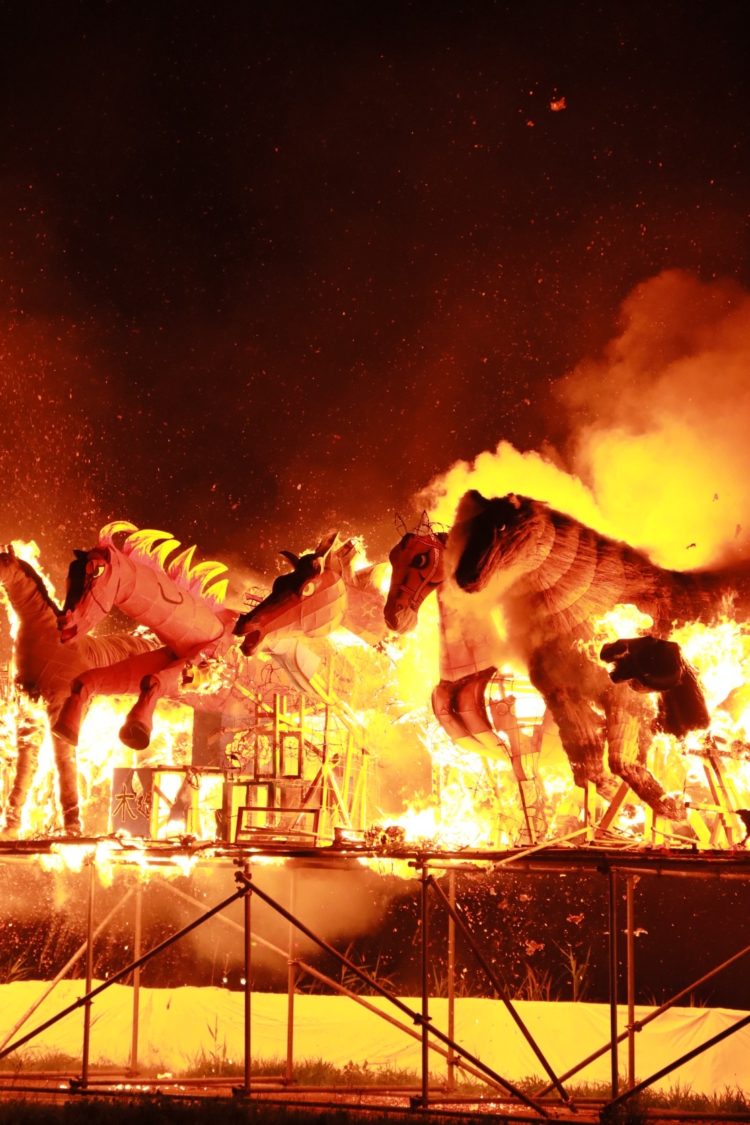 なお、こちらが過去の馬市まつりの燃え盛る馬ねぶたの様子。凛々しい顔の馬たちが炎に包まれ、まさに魂が燃え上がるような神々しさを感じます。
