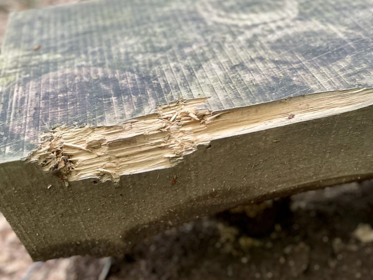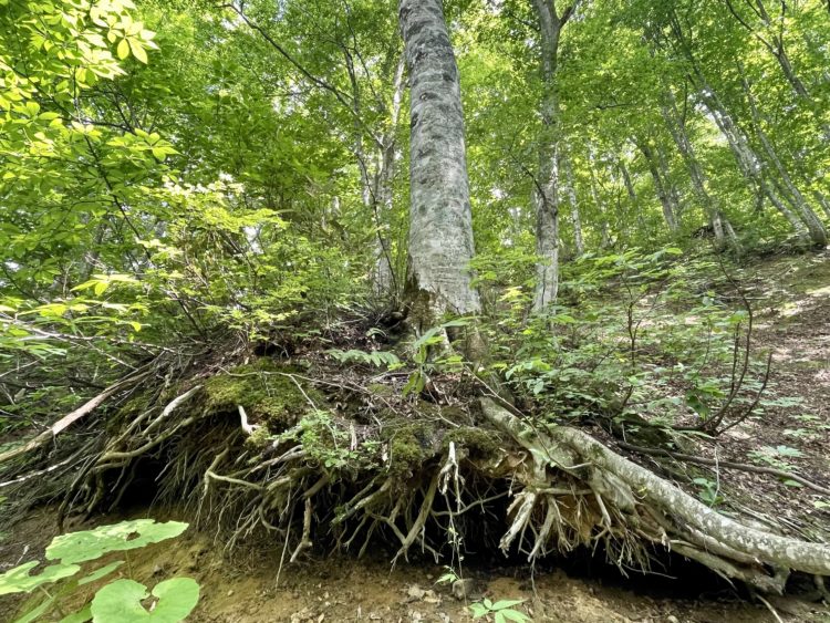 人の気配を感じると熊も怖がって近づいてこないそうですが、こうしてブナ林の山道にも普通に現れるそうです。ベンチや看板などのシンナーが気になるようで、かじったりひっかりたりしていくんだとか。