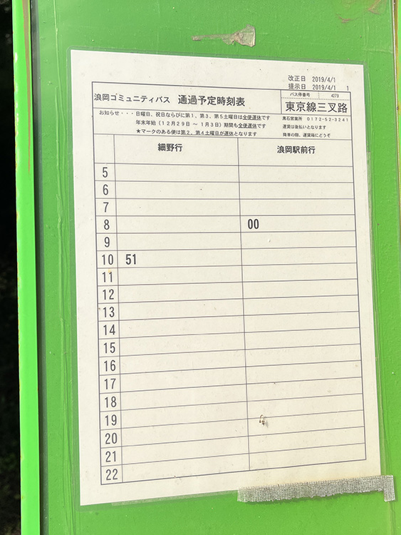 のちに調べたところによると、この「東京線三叉路」なるバス停は、「浪岡地区コミュニティバス」というものができたときに新設されたらしく、なんとバス停の開設は2010年!めちゃくちゃ新しい。