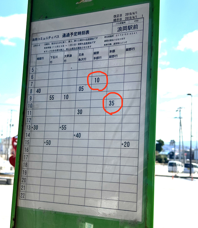 「東京線三叉路」に行けるバスは、午前中にたった2本だけで、一部の土曜と日曜は運休です。できれば実際にこのバスに乗って向かいたかったけど、うっかりミスで、バスの運休の日に調査に行くことにしてしまいました。浪岡駅で待ち合わせ、2メートル氏の車で直接現地に向かいます。