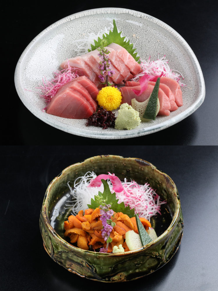 などという蘊蓄はさておき、百聞は一杯にしかず。「日本料理 百代」での、愉快なペアリング体験をご紹介しましょう。寒さ増す冬は、海の幸に脂がのり旨味を増す季節。たとえば 赤身、中トロ、大トロのマグロの刺身オールスターズは、「田酒」のまるみを帯びた味わいに溶け、互いの旨味がグンとふくらみました。この日は、「青森大好きで、趣味はフードペアリング」という、銀座「ロックフィッシュ」のオーナーバーテンダー間口一就さんもご一緒に。マグロに「陸奥八仙」を合わせて、笑顔に。おおっ、脂の甘味がふくらむではないですか。一方でウニと「豊盃」は、甘味が一つにとけあう厚みのある二重奏に感無量。なんて、すてき♡