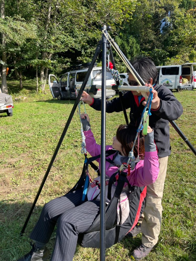 シミュレーションではこちらの器具を使ってブランコのようにぶら下がりながら姿勢の練習をします。