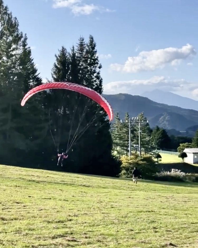 タンデム(2人乗り)フライト体験は以上となりますが、体験者は更にそのまま高原で「1人用のパラグライダー体験」もちょこっとお試しさせてもらえるんです。