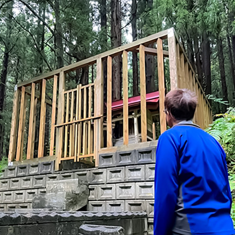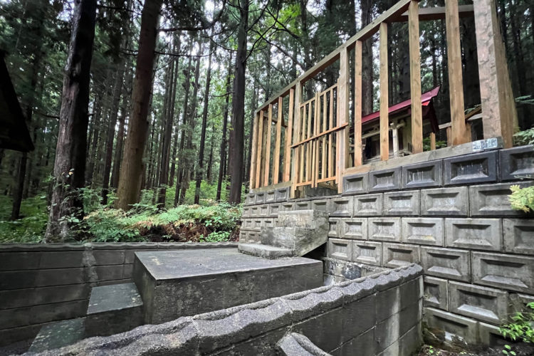 さっきの社殿はただの入り口だったのかもしれない。奥に本当の社殿(?)がある、しかも、木で囲われて、まるで牢のように……。守っているようでもあり、封印しているかのようでもあり。鬱蒼とした森に囲まれて、私たちはちょっとひんやりした気持ちになった。