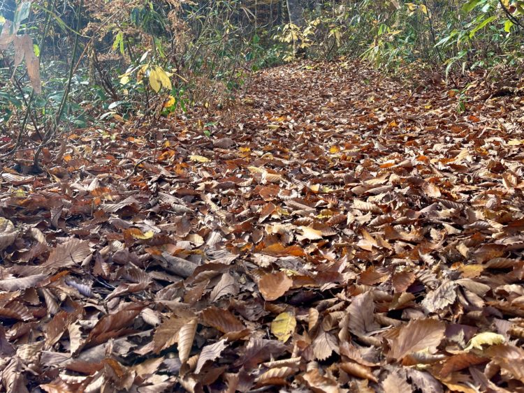 この葉が落ちた後、幾つもの層に重なり合い、質のいい腐葉土を作るのでブナ林の道はふかふかになります。