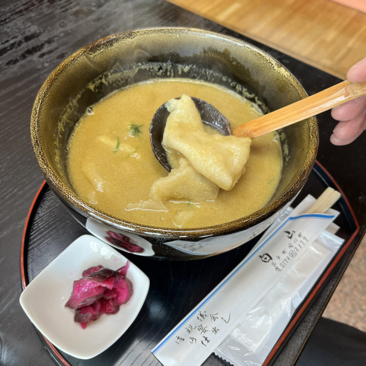 車で三戸町に行き「割烹白山(しらやま)」ののれんをくぐった。注文したのは「川蟹すいとん」。川蟹はシャンハイガニの近縁種、モクズガニのことだ。このカニを使った汁ものは各地にあり、私は何カ所かで口にしているが、すいとん仕立てのものは初めてだった。