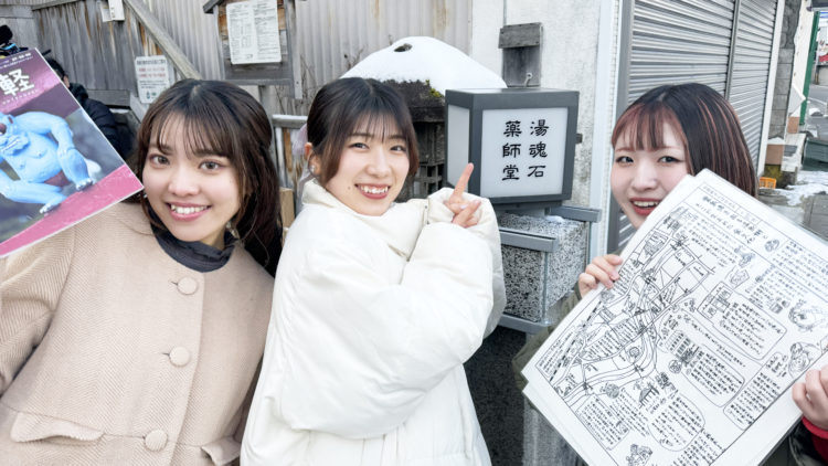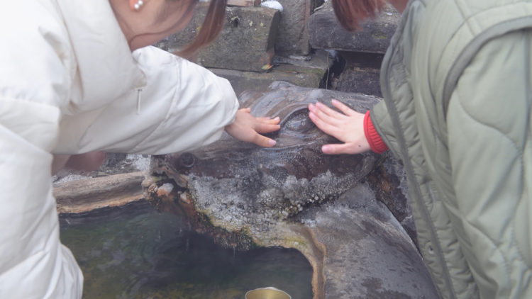 そして、さんぽのスタートは、津軽の殿様・為信が眼病を治したと言う、鰐さんのお口から湯がコンコンと湧き出ている「湯魂石薬師堂」。じわ~っと熱くて、何だか効きそう(単純?(笑))!