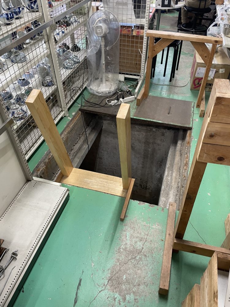 「ここら辺の商店街は昔大火があって、それから火事の時に逃げ込めるように地下室を持っている店舗が多いんです。ここを面白いと感じた栗林隆さんがこうして地下室に作品を作ったんです。あの坂本龍一さんも見に来られたんですよ」