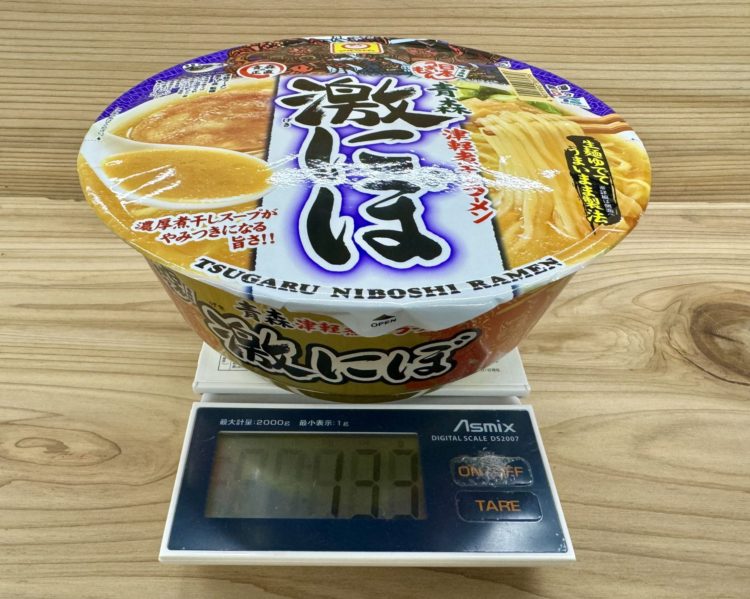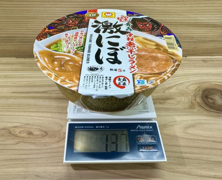 ※新旧の激にぼともに、内容量の表示は「110g(めん70g)」となっておりますが、今回の計量結果は、「計量法」で定める誤差の範囲内なのでご安心を。秤もカップ麺計量用の精密なものではありませんので、大らかな目でご覧ください。
