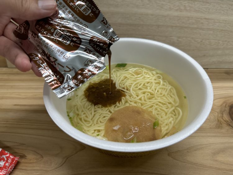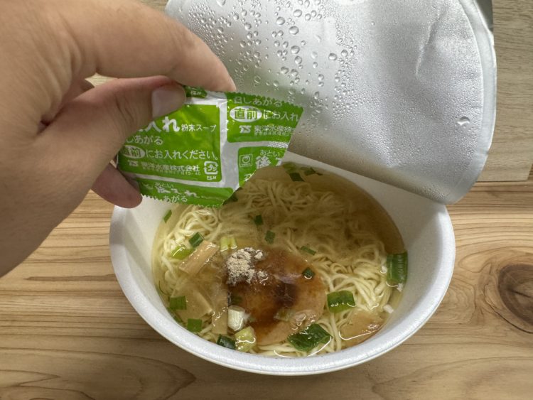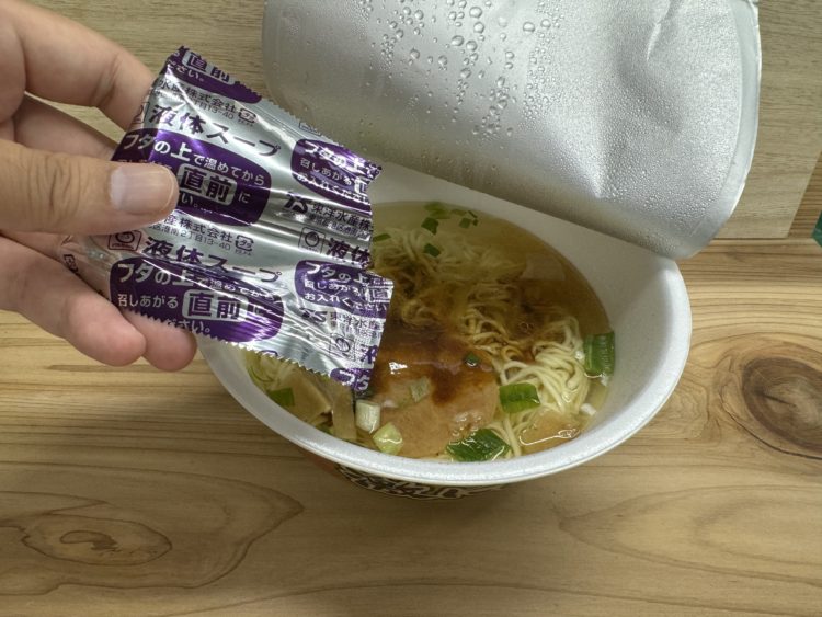 さあ、こちらも丁寧にお湯を注ぎます。1分ほどでもう食べたくなります。いっちゃうか?我慢我慢。5分経過。すかさずいただきます。