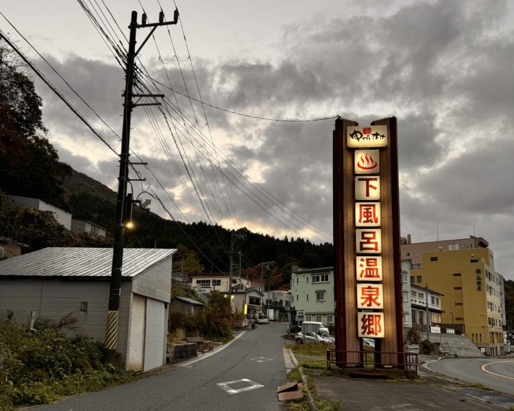 下風呂温泉郷の看板に灯りがともってエモいです!