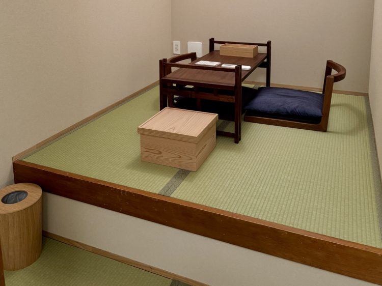 通していただいたのは8畳ほどの広さでシンプルなお部屋。テレビやトイレ、お風呂はなく、部屋の中央に座布団と茶器の入った台が置いてあるのみの空間です。