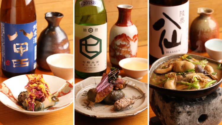 津軽味噌のきれいなコクがカキの旨味と同調する「カキの田舎味噌仕立て」は、その名とは裏腹に洗練された世界が構築されていた。競演は40度の八戸酒造「陸奥八仙 特別純米」。冷酒では隠れていた、ほんのりクリーミーでなめらかな味わいと、洋酒をも彷彿とさせる艶やかな旨さがあり、ふくらみを増した酒の酸が味噌やカキの旨味を包み込む。「陸奥八仙の酸が、味噌と合うと思います」とは、小笠原さん。いや、合いすぎます! ゴボウやセリ、ネギも、酒とともに口に含めばそれぞれの風味がよりくっきり。日頃から冷酒で親しんでいる方なら、陸奥八仙のあらたな魅力にふれる機会となるだろう。