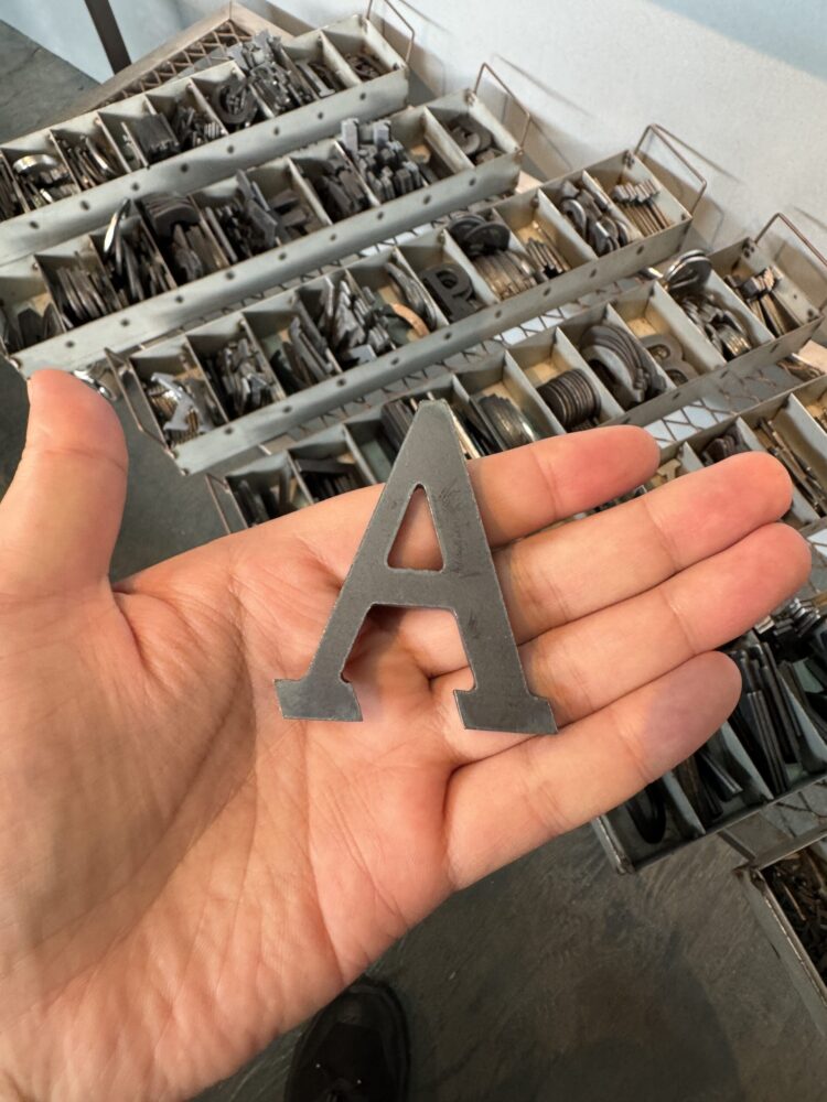 選んだアルファベットとマークを専用台に並べて、いよいよ溶接です。