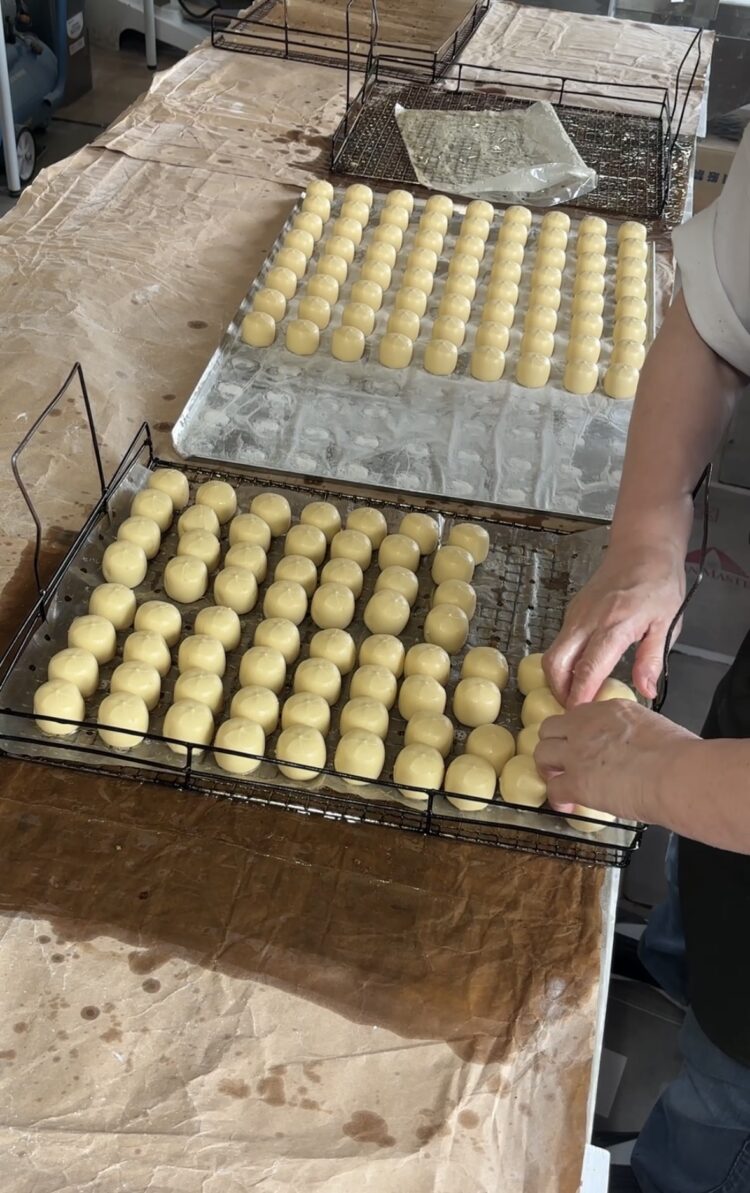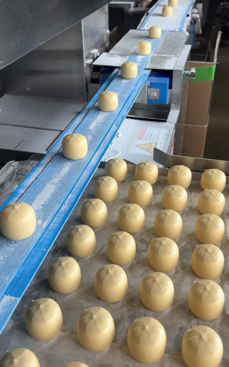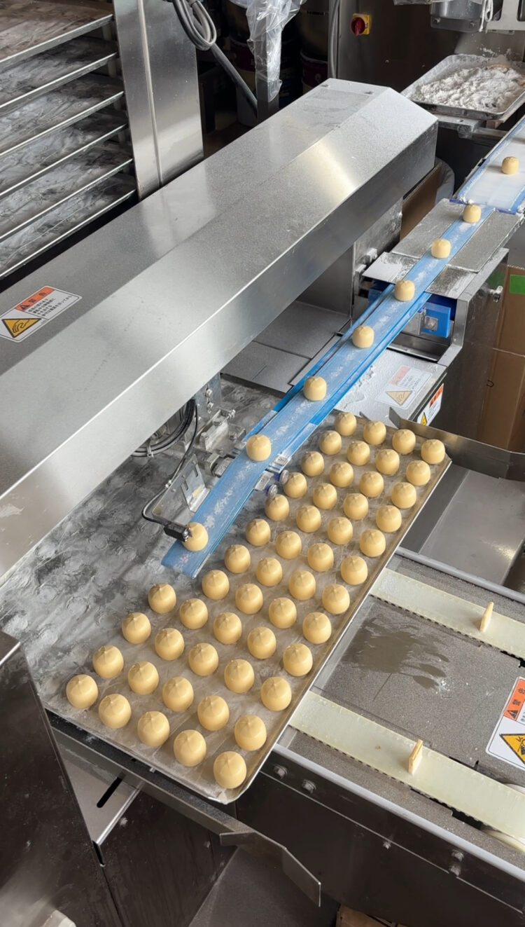 その前にあんこが生地に包まれ、成形されて1つずつ運ばれていく様子をお届け。