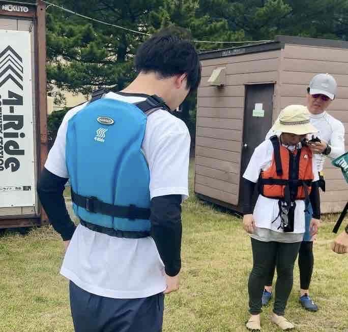 ビーチにたどりつき、まずはもし海に落水しても大丈夫なよう、ライフジャケットを着用します。「あくまで、万が一の話ですよね?何かのフリではないですよね??」とビビる取材班。