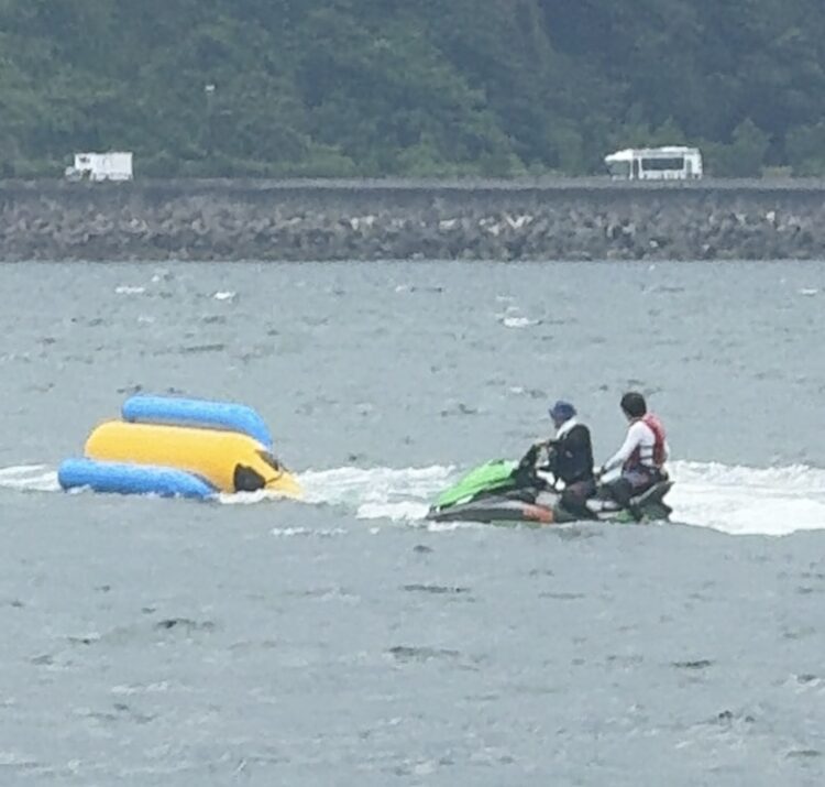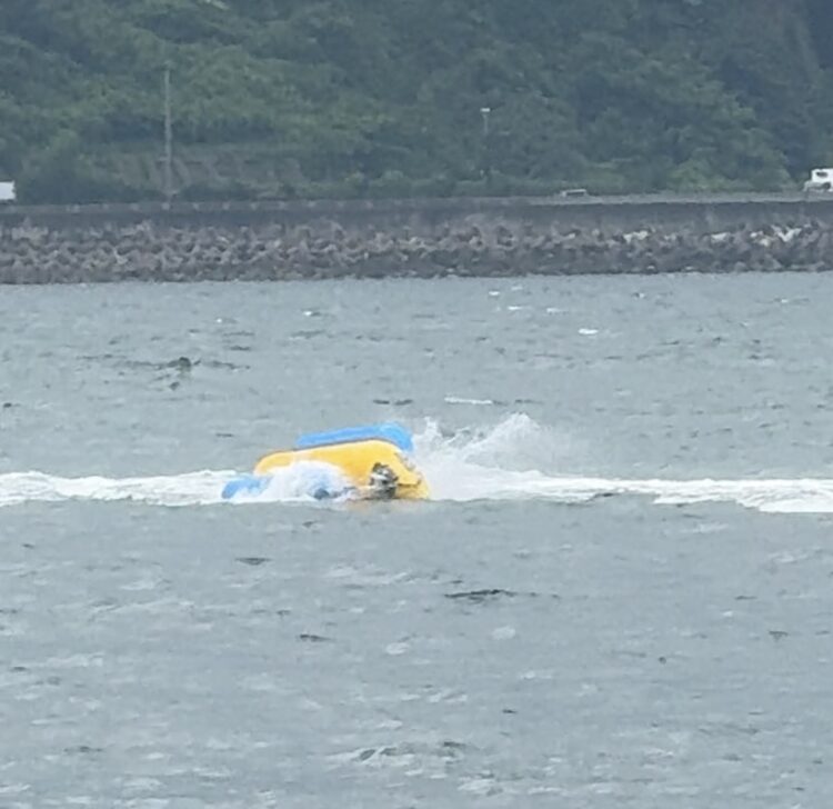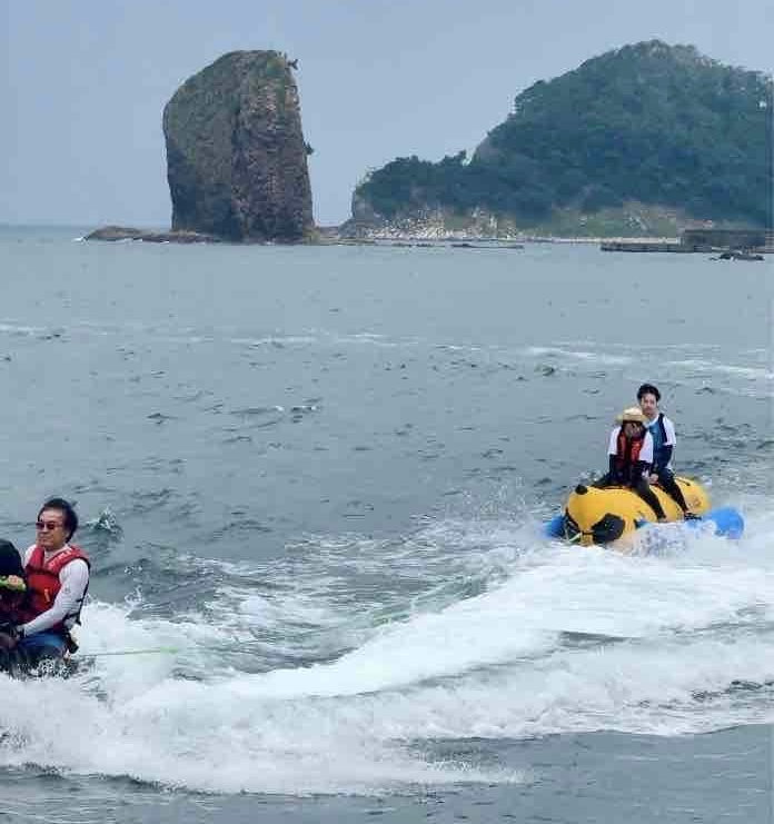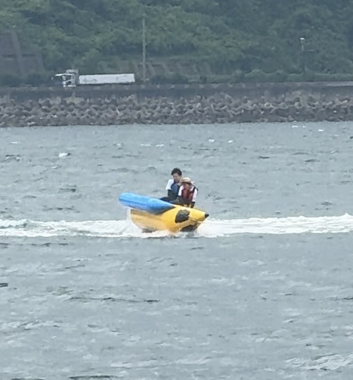 そして目にも鮮やかなバナナボートにまたがります。ジェットスキーに先導されながら、浅虫温泉の象徴・湯の島の方向へとゆっくりと滑り出していきます。