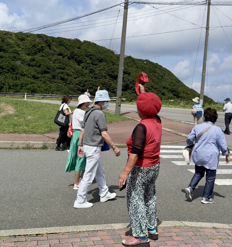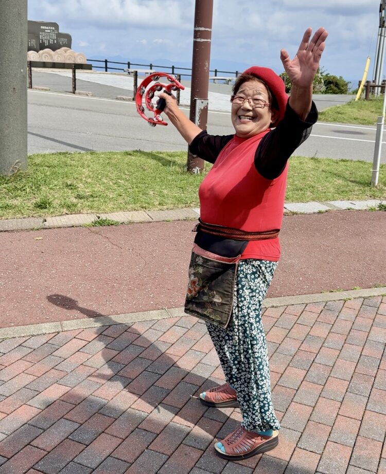 観光客の姿を認めるやいなや大声で声をかけ、赤いタンバリンを派手に打ち鳴らしながら近づいていく赤い服の陽気な女性。青森県では有名な「たっぴの母さん」こと、水嶋 夏子さん(76歳)です。