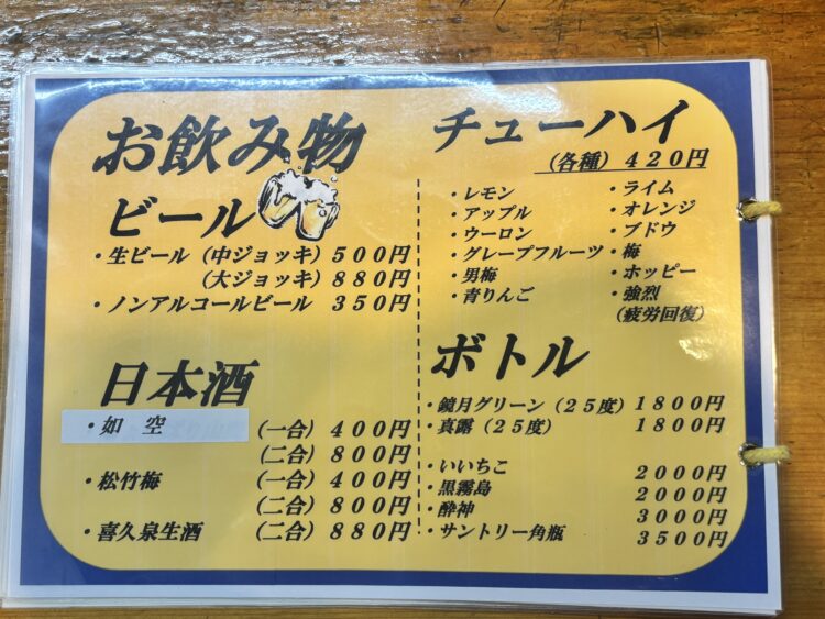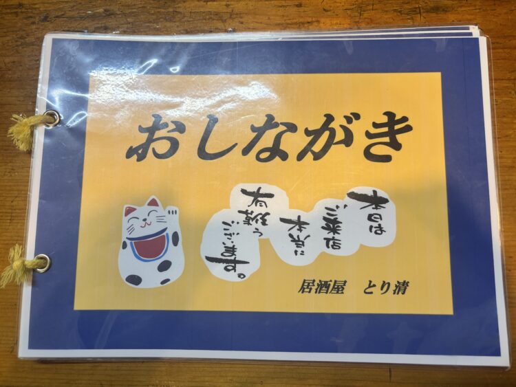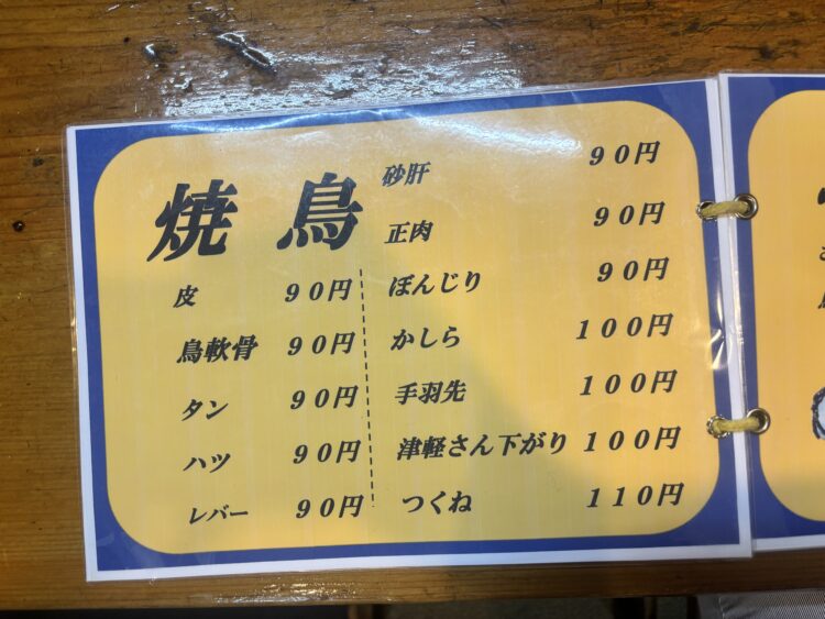 メニューの1枚目は焼鳥。そうですよね、のれんに「やきとり」って書いてましたもんね。
