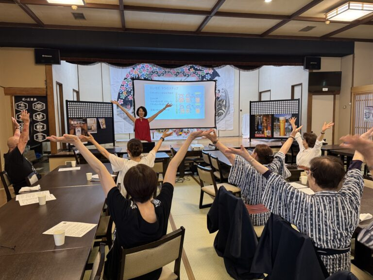 こちらは、笑いで健康になる「笑いヨガ講座」。講師の津島先生と一緒に「笑いエクササイズ」を体験して、笑いを健康法にするトレーニングを行いました。