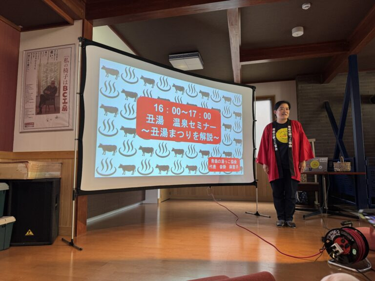 それとこちらは「青森の湯っこ協会」代表 沓掛(くつかけ)さんによる「丑湯温泉セミナー」。これまで47都道府県2,500か所以上もの温泉を巡った温泉マニアである沓掛さんだからこそ話せる、丑湯にまつわる知識が満載のセミナーでした。