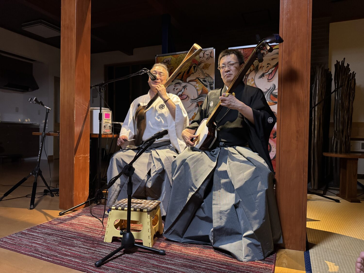 夜は、青森市のスコップ三味線居酒屋「鐵の響(くろがねのひびき)サフロ」店主の吉崎さんによる、スコップ三味線演奏も。過去にスコップ三味線の世界大会で優勝経験もある吉崎さんの妙技と名物の掛け声「ろぉ~」と共に、会場全体が盛り上がりを見せていました。