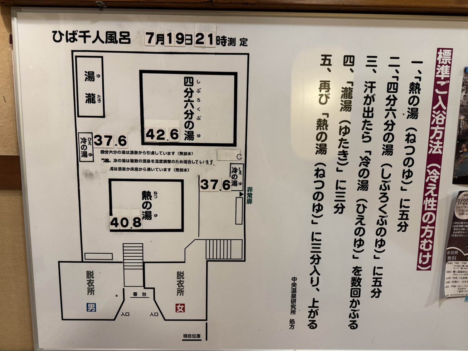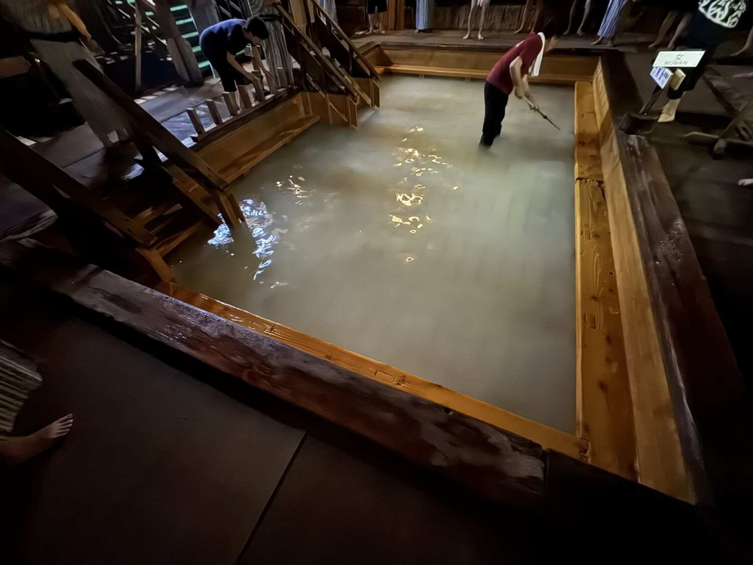 熱の湯を含むヒバ千人風呂は、浴槽の底から源泉が直接湧き出す「足元湧出」のため、常に高い鮮度の泉質を楽しめるのが特徴。そのお湯を全入れ替えしちゃうんですから、普段はお目にかかれない、湧き立てホヤホヤ、生まれたて赤ちゃんのような源泉を楽しめる貴重なタイミングということで、眠い目をこすりながら湯舟にお湯が満たされていく様子を見守ります。