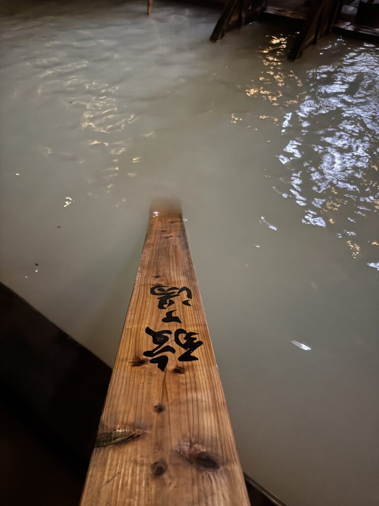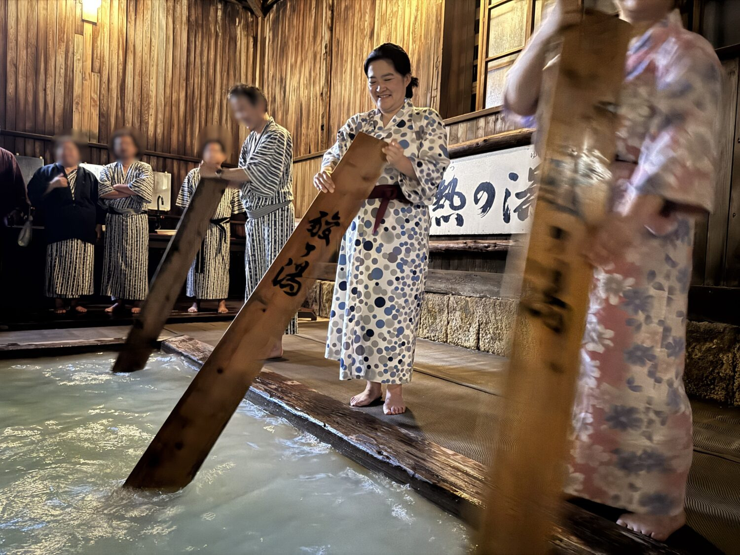 最初のお湯抜きから約4時間後の午前1時30分。ついに熱の湯の湯替えが完了し、みんなで湯もみをしました。この湯もみも年に1回、丑湯祭り限定の貴重な行事で、お湯の肌当たりを柔らかくし、入浴しやすい温度に調節する効果があります。